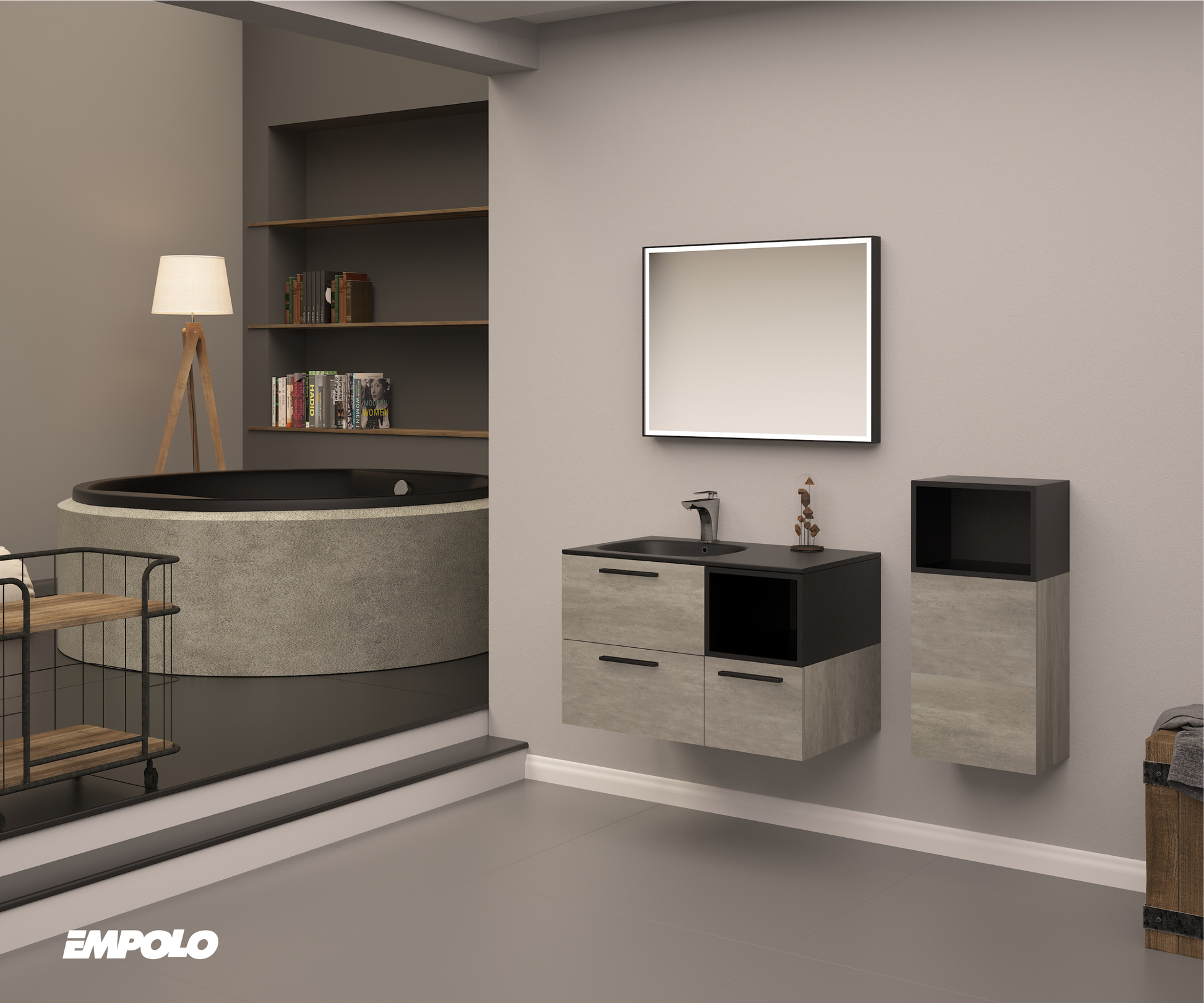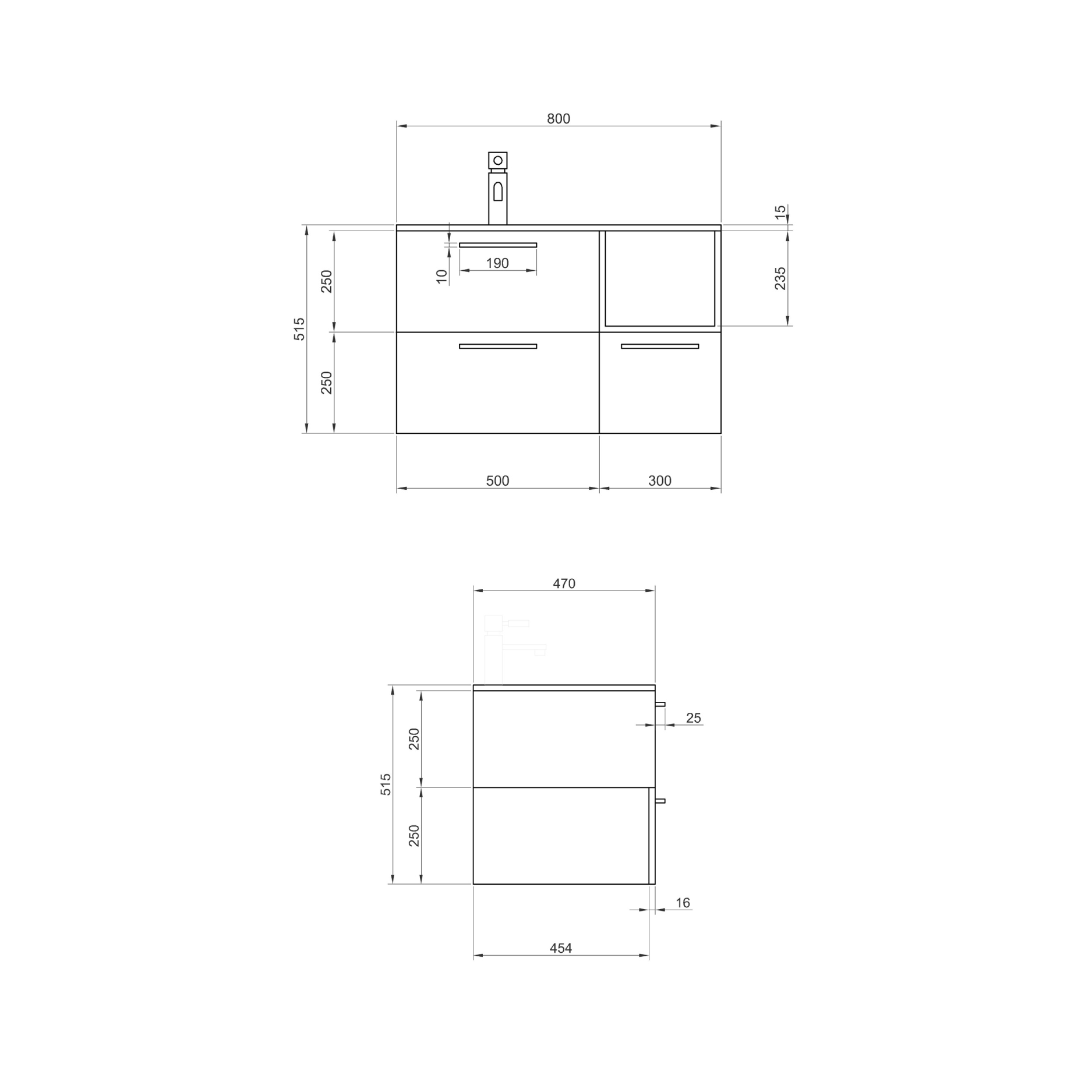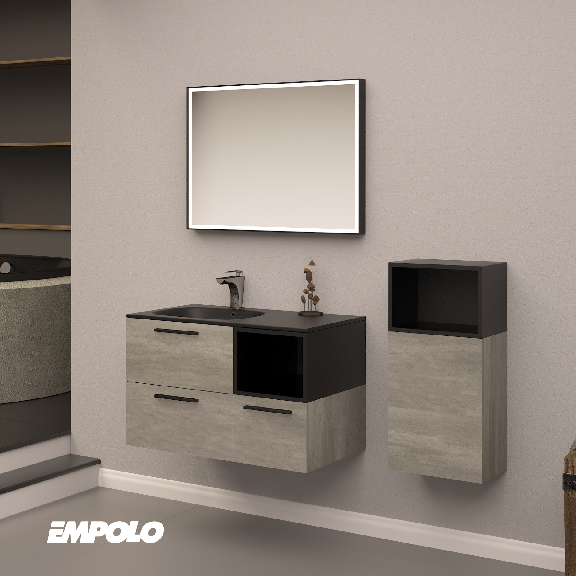 Main cabinet - Size: 800*470*515mm - DTC rail - Matt sandy black and cement grey. (note: only includes the main cabinet - basin, mirror and side cabinets sold separately).
